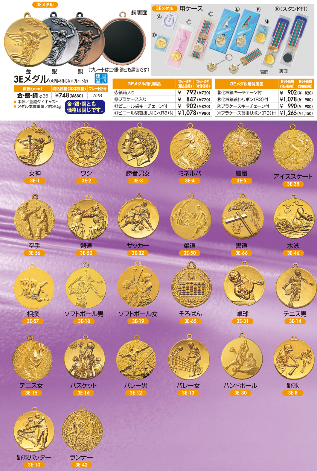 低価格なメダルのご紹介になります。(取寄せ商品) 首掛けリボンがついているタイプで一番低価格なものは F化粧箱(紙ケース)首掛けリボン付¥1078(税込)となっております。金・銀・銅色の3色から選択可能です。