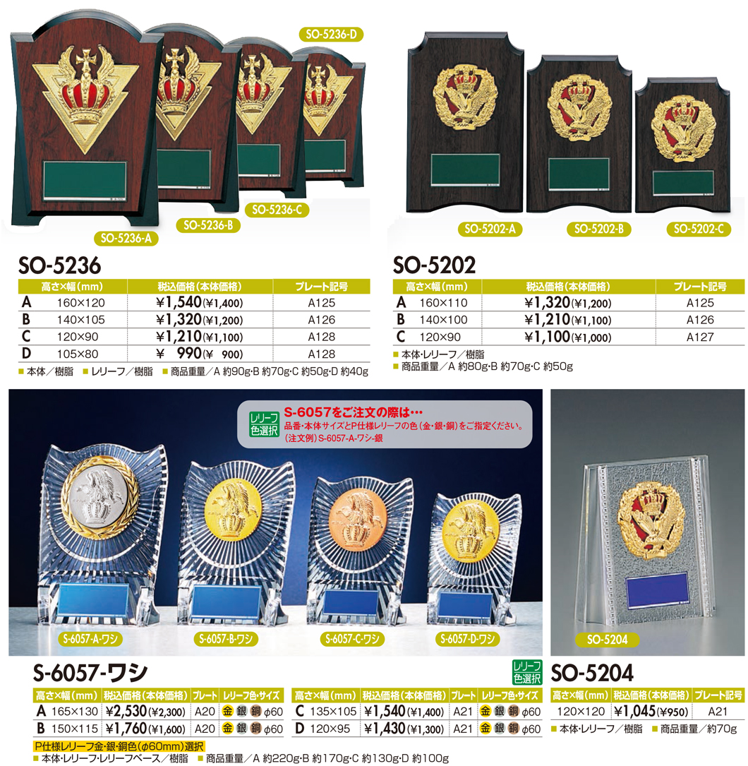 低価格な表彰楯のご紹介になります。 S-6057につきましてはP仕様レリーフよりレリーフをご選択ください(59種目・金・銀・銅色より選択可能です。)